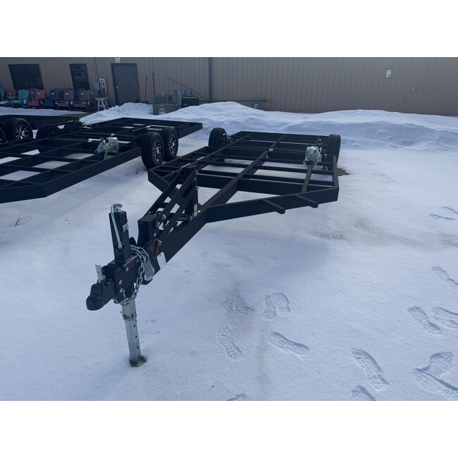 This heavy-duty 8′ x 17′ frame is built with 5,500 lb-rated axles and rides on 225/75R16 load range E tires mounted on durable 8-lug aluminum T07 rims for strength and reliability. The articulating tongue and V-front design enhance towing stability and maneuverability, while the hydraulic system delivers smooth, dependable lifting and leveling on the ice.