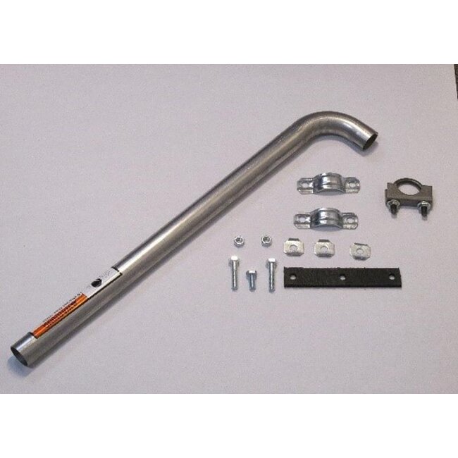 18 Guage aluminized 90 degree tailpipe kit that includes a clamp and hanger.Â