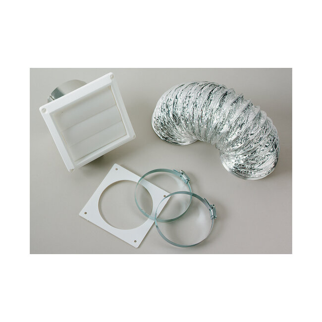 Included: Louvered vent cover, two worm-driven screw clamps, inside collar, and 2' of flexible metal ducting